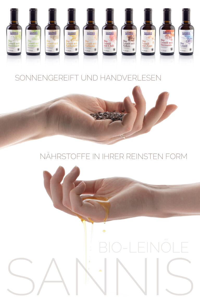 Unser spezielles SANNIS-Pressverfahren garantiert eine einzigartige, schonende Pressung des Leinsamens bei einer Presstemperatur von unter 30 °C. Bis zu 55 % wertvolle Omega-3-Fettsäuren sind in 100 ml SANNIS Bio-Leinölen enthalten. Durch die schonende Pressung werden keine Bitterstoffe in die Öle abgegeben, so dass SANNIS Bio-Leinöle einzigartig mild, nussig und cremig schmecken.