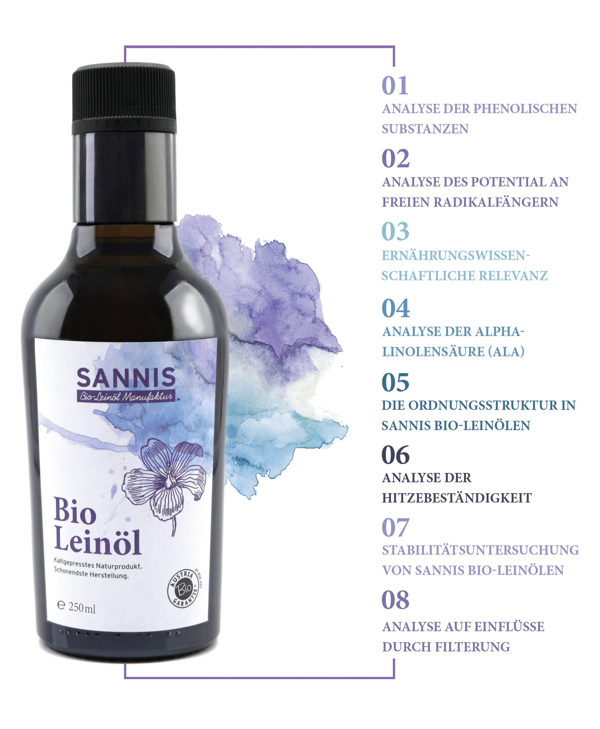 Gemeinsam mit dem Labor für Innovative Analytik in Innsbruck unter Federführung von Univ. Prof. Mag. Dr. Christian Huck und Dr.rer.nat. Matthias Schmutzler sind chemische qualitative und quantitative Analysen für SANNIS Bio-Leinöle durchgeführt worden.