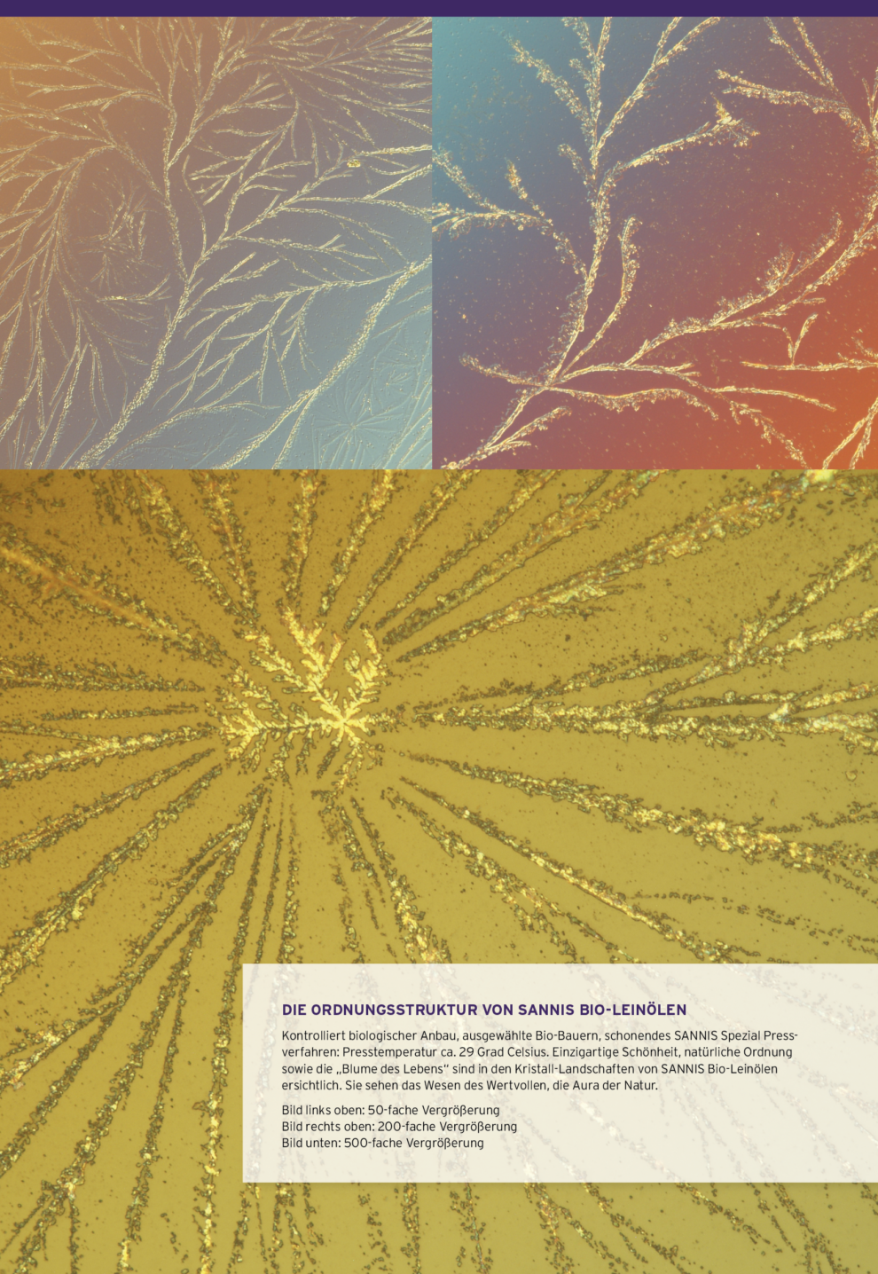 Wir von SANNIS sind beseelt von der Herstellung unserer Bio-Leinöle. Deshalb erfüllt uns es mit Stolz, dass es uns in Zusammenarbeit mit dem Forschungsinstitut LifevisionLab von Soyana (CH) als erste Bio-Leinöl-Produzenten gelungen ist, die in unseren Bio-Leinölen enthaltenen „Informationen“ – ihre Ordnungsstruktur – durch Kristallisation sichtbar zu machen.